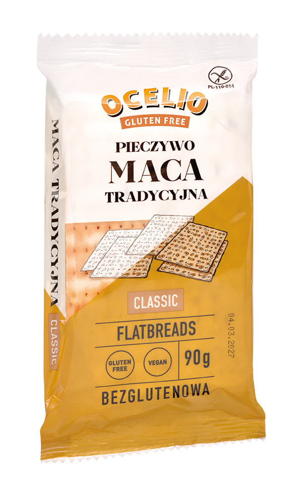 Bezglutenowa tradycyjna maca Ocelio to chrupiąca przekąska, która z powodzeniem może zastąpić tradycyjne pieczywo. Jest lekkostrawna, a jej smak doskonale komponuje się dodatkami, takimi jak hummus i pasty warzywne. Mieszanka bezglutenowych skrobi i płatków ziemniaczanych sprawia, że maca Ocelio może być spożywana przez osoby na diecie bezglutenowej.