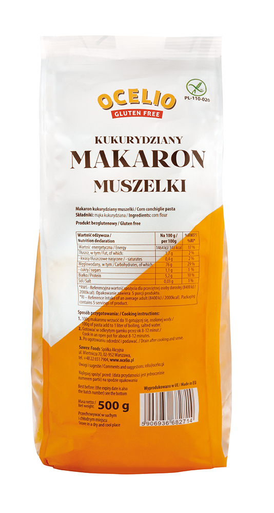 Bezglutenowy makaron muszelki to pyszny dodatek do zup, sałatek i zapiekanek. Wyjątkowy kształt oraz smak sprawiają, że makaron conchiglie Ocelio z pewnością będzie ozdobą każdego dania. Składa się w 100% z mąki kukurydzianej, co gwarantuje, że jest w pełni bezglutenowy i może być spożywany przez osoby zmagające się z celiakią oraz uczulone na ten alergen. Prosty skład oraz brak zawartości glutenu sprawiają, że to idealny dodatek obiadowy dla wszystkich zwracających szczególną uwagę na swoją dietę.