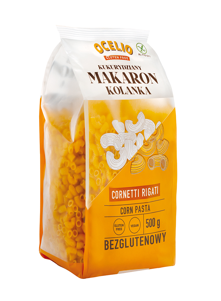Bezglutenowy makaron cornetti Ocelio to pyszny i sycący dodatek do zup, sałatek i zapiekanek. Jego wyjątkowy kształt oraz klasyczny smak sprawiają, że będzie smaczną ozdobą każdego dania. Składa się w 100% z bezglutenowej mąki kukurydzianek, dzięki czemu może być spożywany przez osoby zmagające się z celiakią oraz uczulone na gluten. Makaron Ocelio posiada znak Przekreślonego Kłosa.
